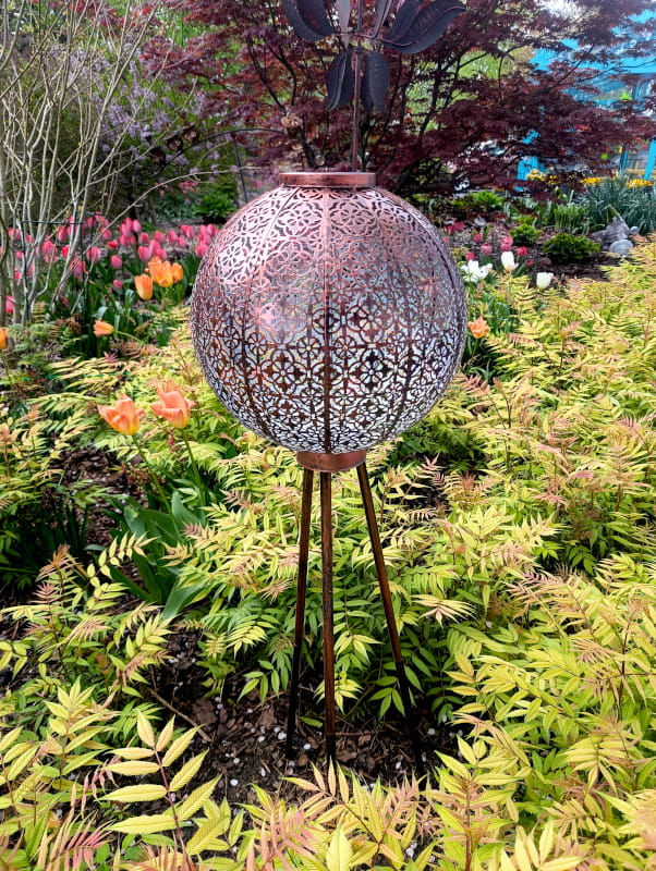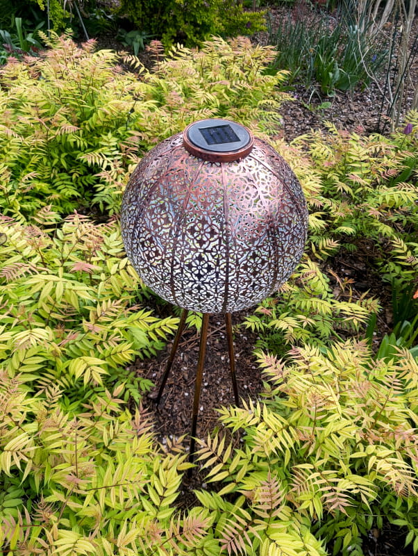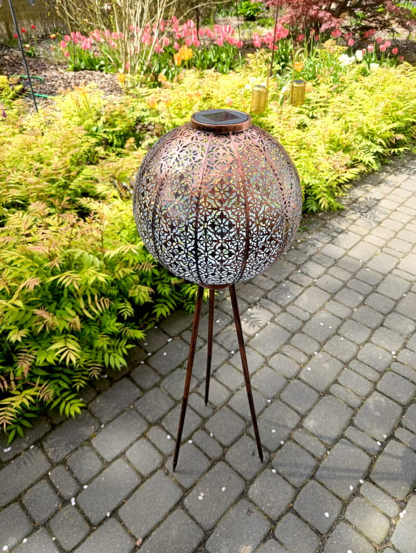 Ogromną zaletą tego ażurowego lampionu jest fakt, że po zmierzchu roztacza on nastrojowe, delikatne światło, które wyznacza ciągi komunikacyjne lub zdobi miejsce wieczornego relaksu na świeżym powietrzu.
