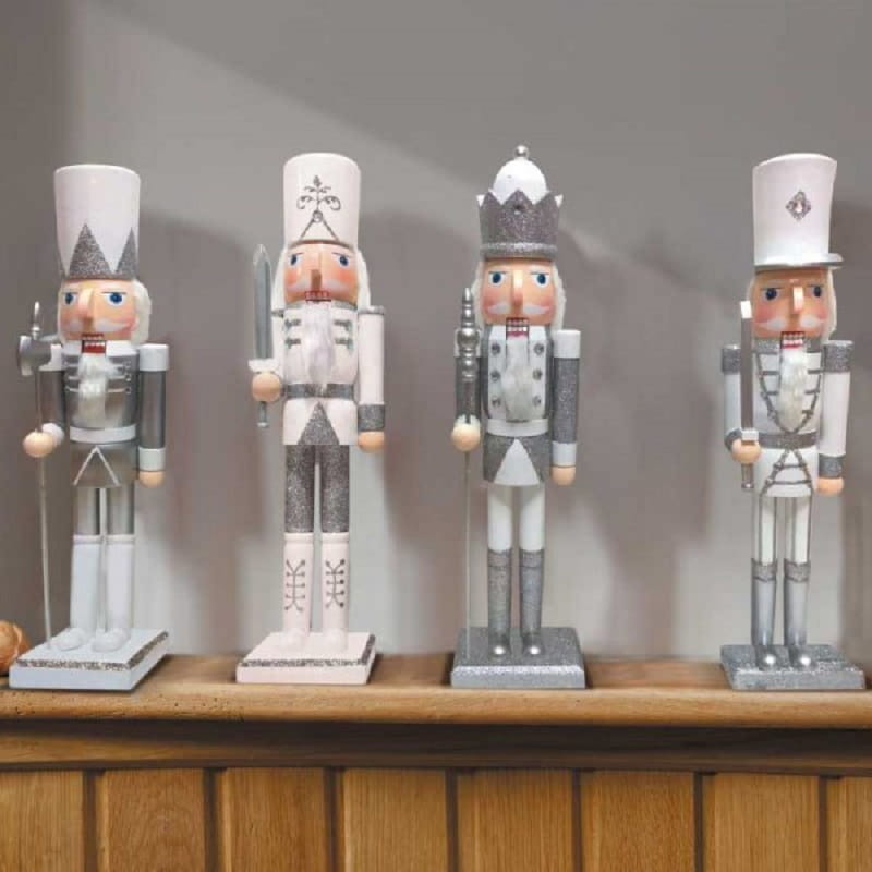 Biało-srebrny, ręcznie malowany Dziadek do Orzechów to idealna ozdoba na czas Adwentu i Świąt.