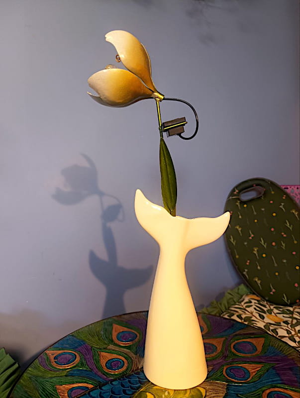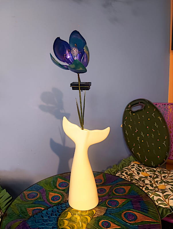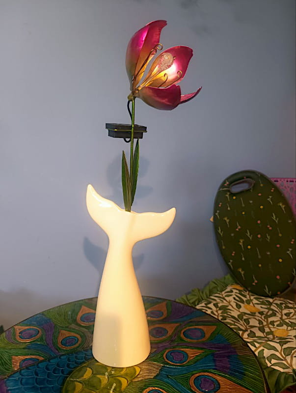 Ta wyjątkowa dekoracja ogrodowa łączy w sobie artystyczny kunszt i funkcjonalność, tworząc bajeczny akcent zarówno w dzień, jak i po zmroku.