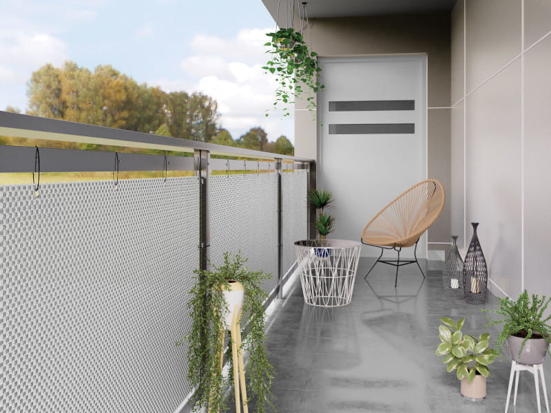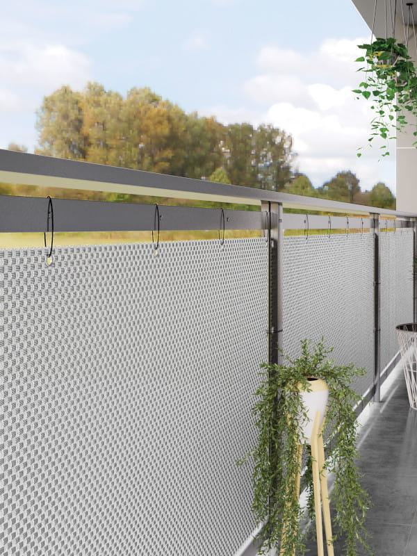 Jeśli montujesz osłonę na barierce balkonu lub tarasu możesz przepleść opaski zaciskowe przez oczka maty i zacisnąć je na przęsłach balustrady.