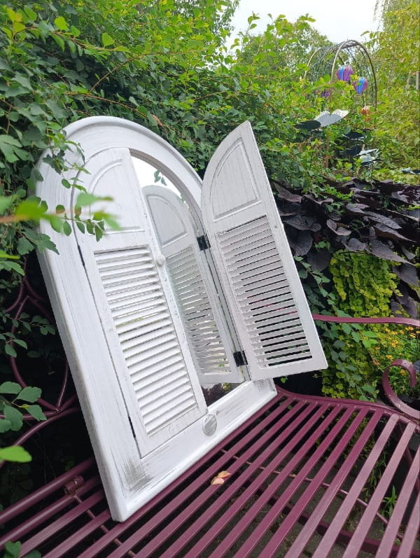 Biało-srebrzyste Lustro Ogrodowe z Okiennicami wykonane jest z materiałów odpornych na zmienne warunki atmosferyczne, co czyni go idealnym do używania zarówno wewnątrz, jak i na zewnątrz.
