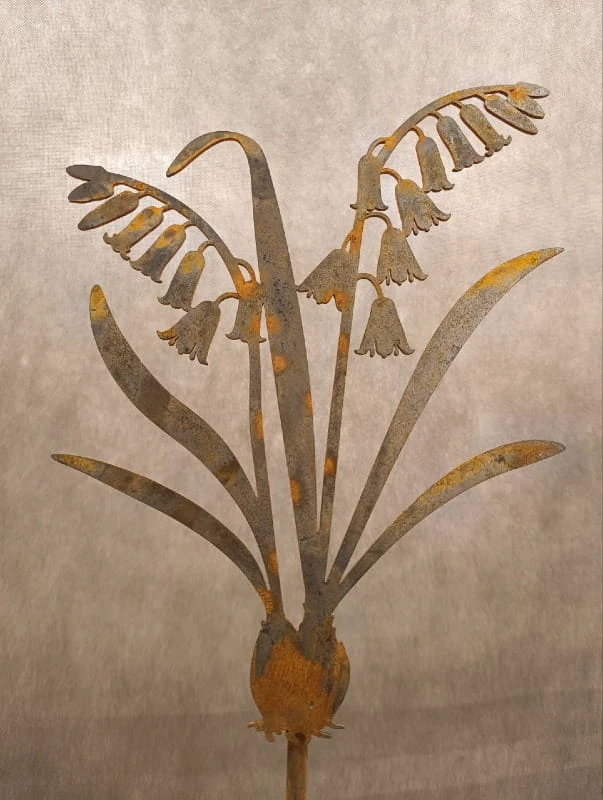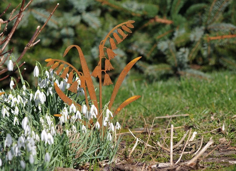 Dzięki swojej rdzawej powierzchni, dekoracja doskonale komponuje się z ziemią, korą i zielenią, wtapiając się w ogród w sposób naturalny i nienachalny.