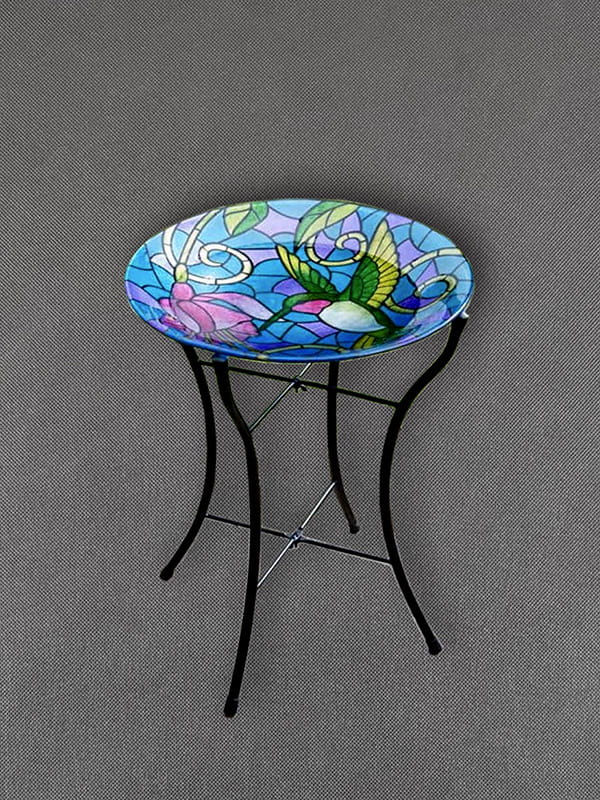 Efektowne ręcznie malowane szkło: Poidło dla ptaków wykonane jest z wyjątkowego, ręcznie malowanego szkła, które przyciąga wzrok swoim pięknym wzorem i kolorami. Dzięki temu każde kąpielisko jest niepowtarzalne i stanowi wyjątkową ozdobę ogrodu.