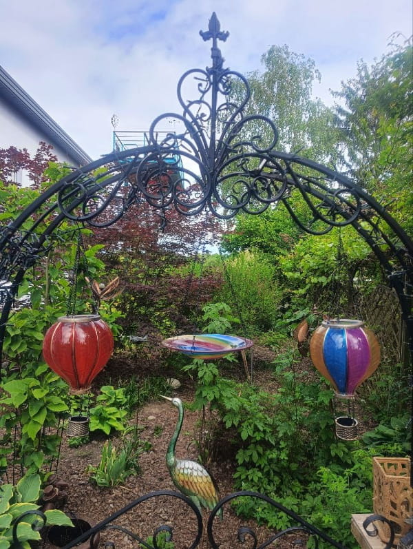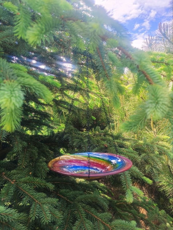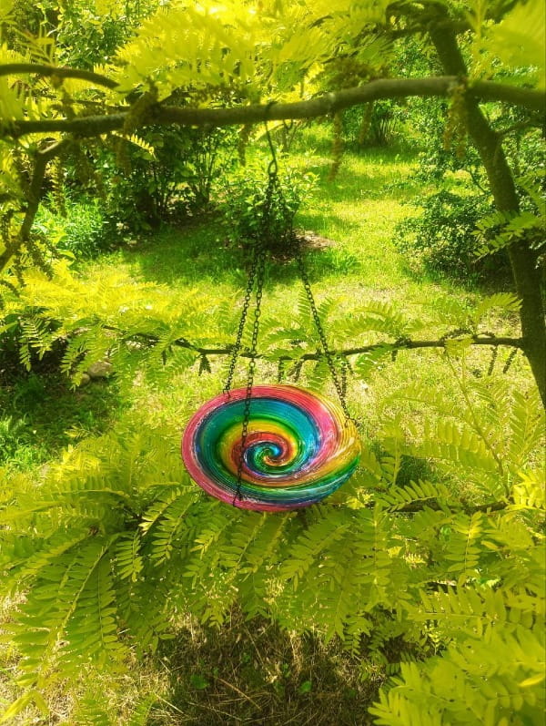 Jego wielobarwna, szklana misa lśni w słońcu, zachęcając skrzydlatych gości do przystanku na orzeźwiającą kąpiel lub chwilę odpoczynku przy posiłku.