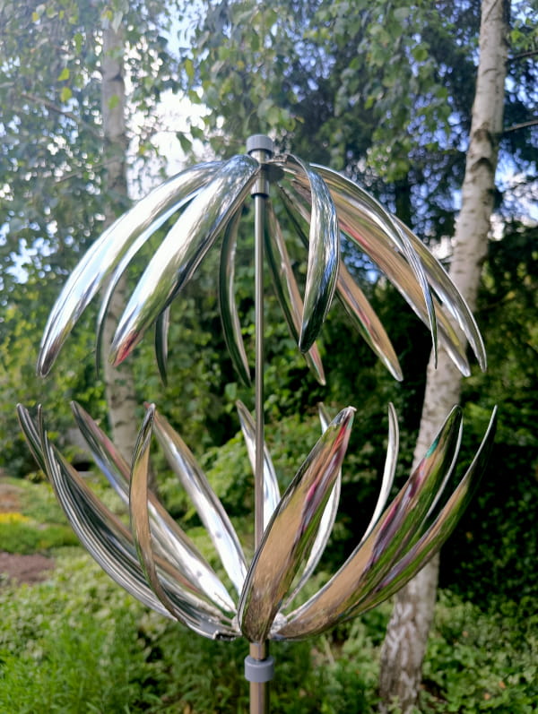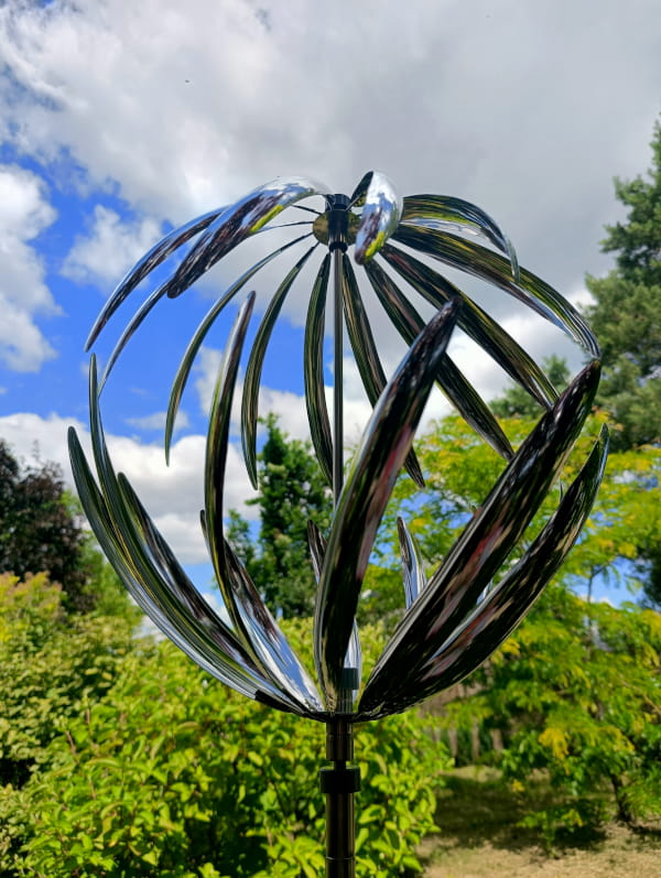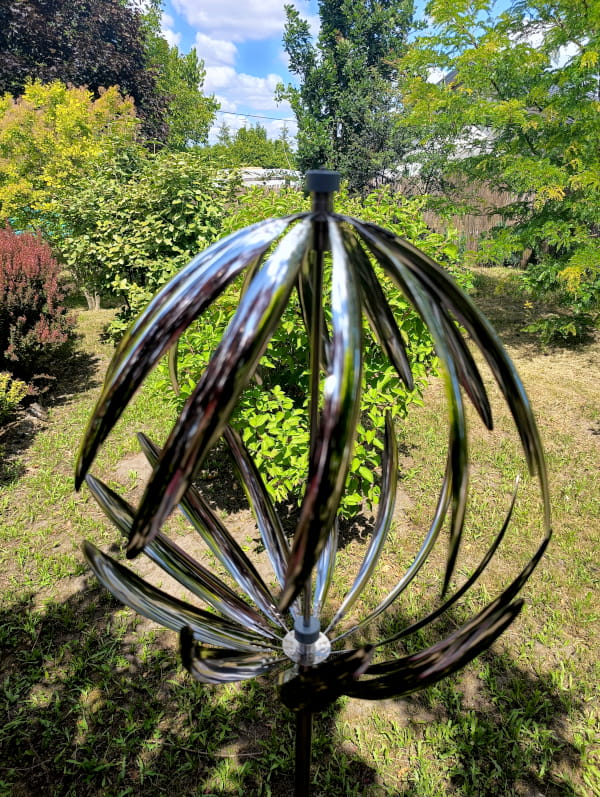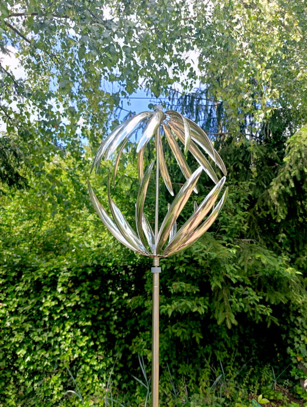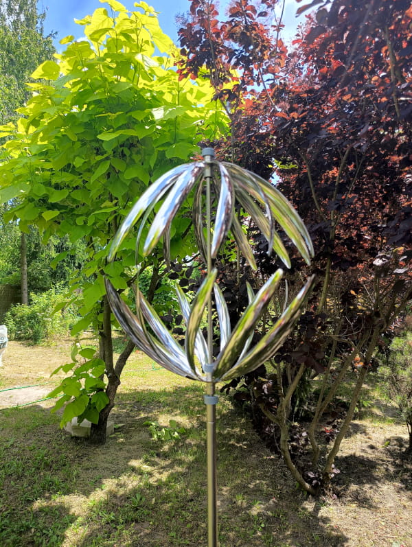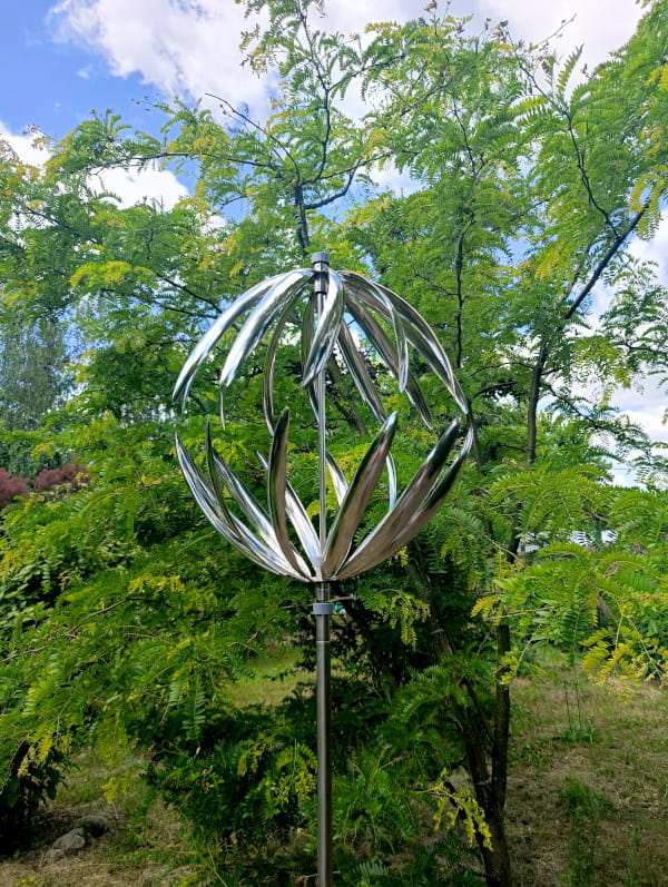 Jak zorza polarna rozświetlająca nocne niebo, tak ta rzeźba wiruje w ogrodzie, reagując na każdy, nawet najdelikatniejszy powiew wiatru.