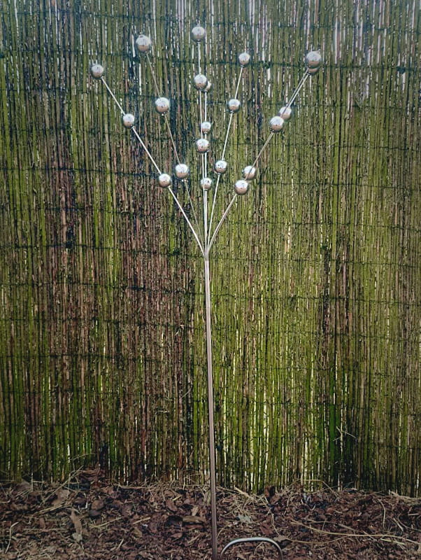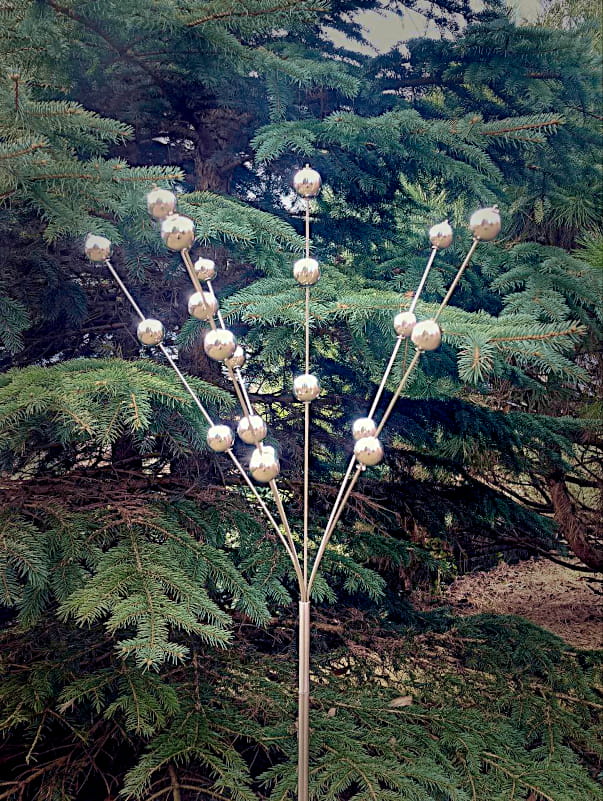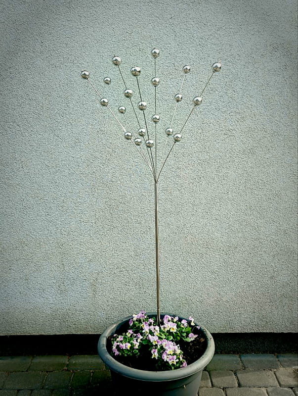 Bukiet Planet to niezwykła rzeźba kinetyczna, która niczym astralne drzewo wyrasta ku niebu, unosząc w przestrzeni srebrzyste kule – planety w tańcu z wiatrem i światłem.