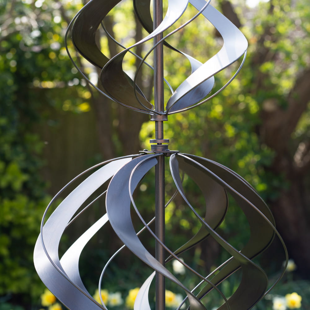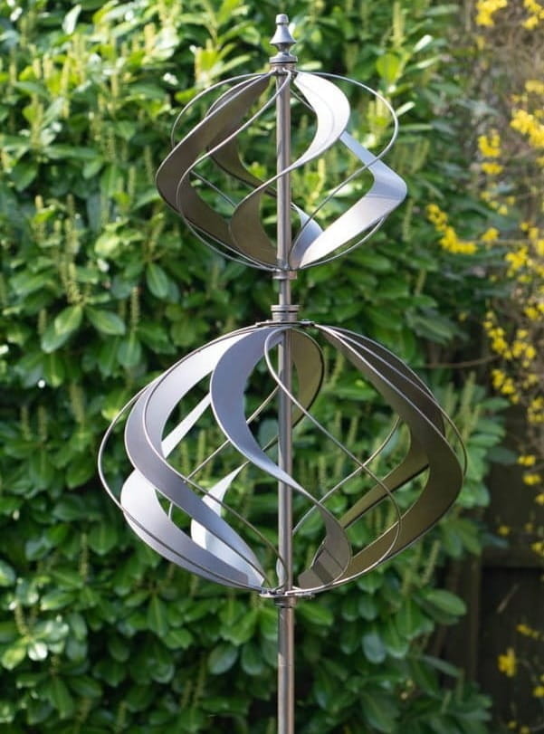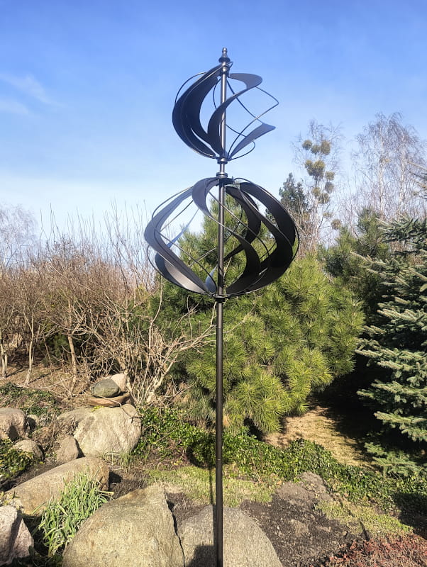Dodaj swojemu ogrodowi wyjątkowy, hipnotyzujący akcent dzięki tej eleganckiej rzeźbie wiatrowej.