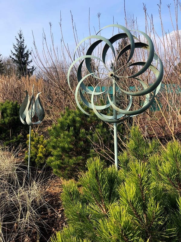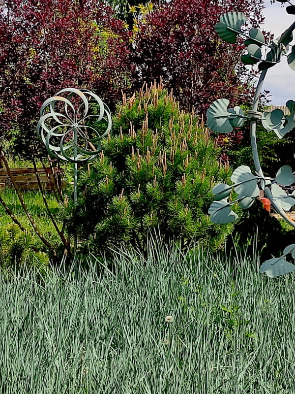 Rzeźbę Kinetyczną możesz też umieścić pomiędzy niższymi od niej krzewami aby optycznie podnieść kompozycję.