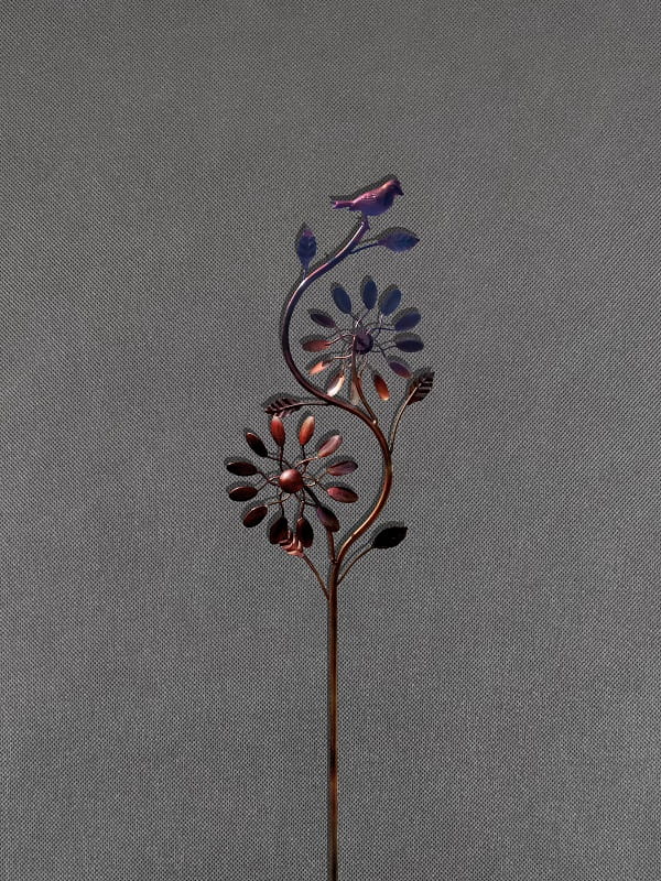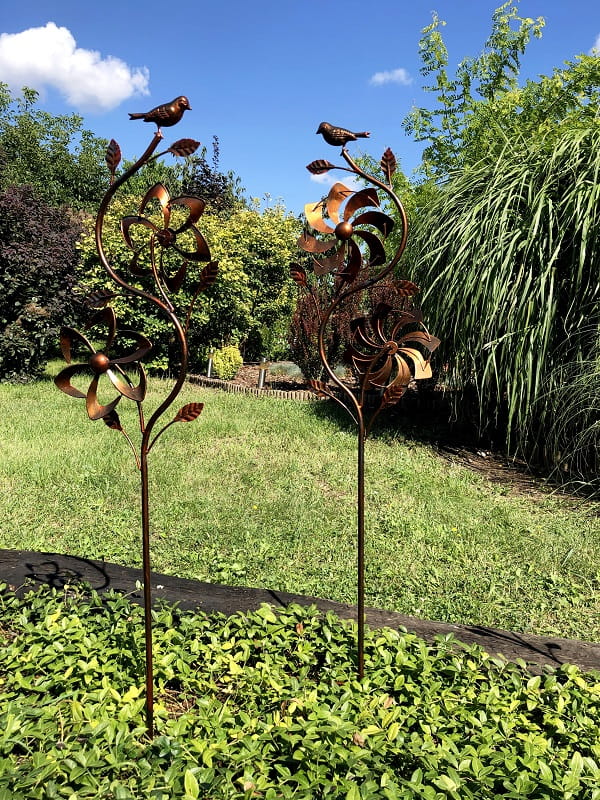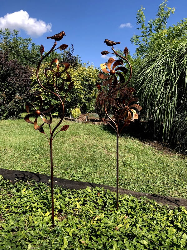 Podwójny wiatrak przyozdobiony jest wdzięcznymi formami ptaków, a całość wykonana jest z metalu odpornego na warunki atmosferyczne.
