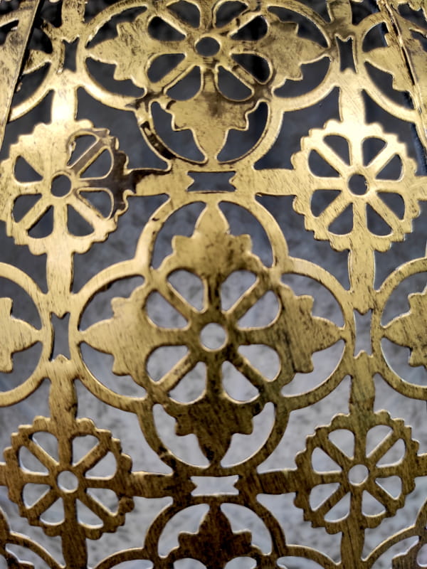 Lampion wykonany jest z metalu w kolorze złota, z jasno szarym tłem prześwitującym z wnętrza lampionu.